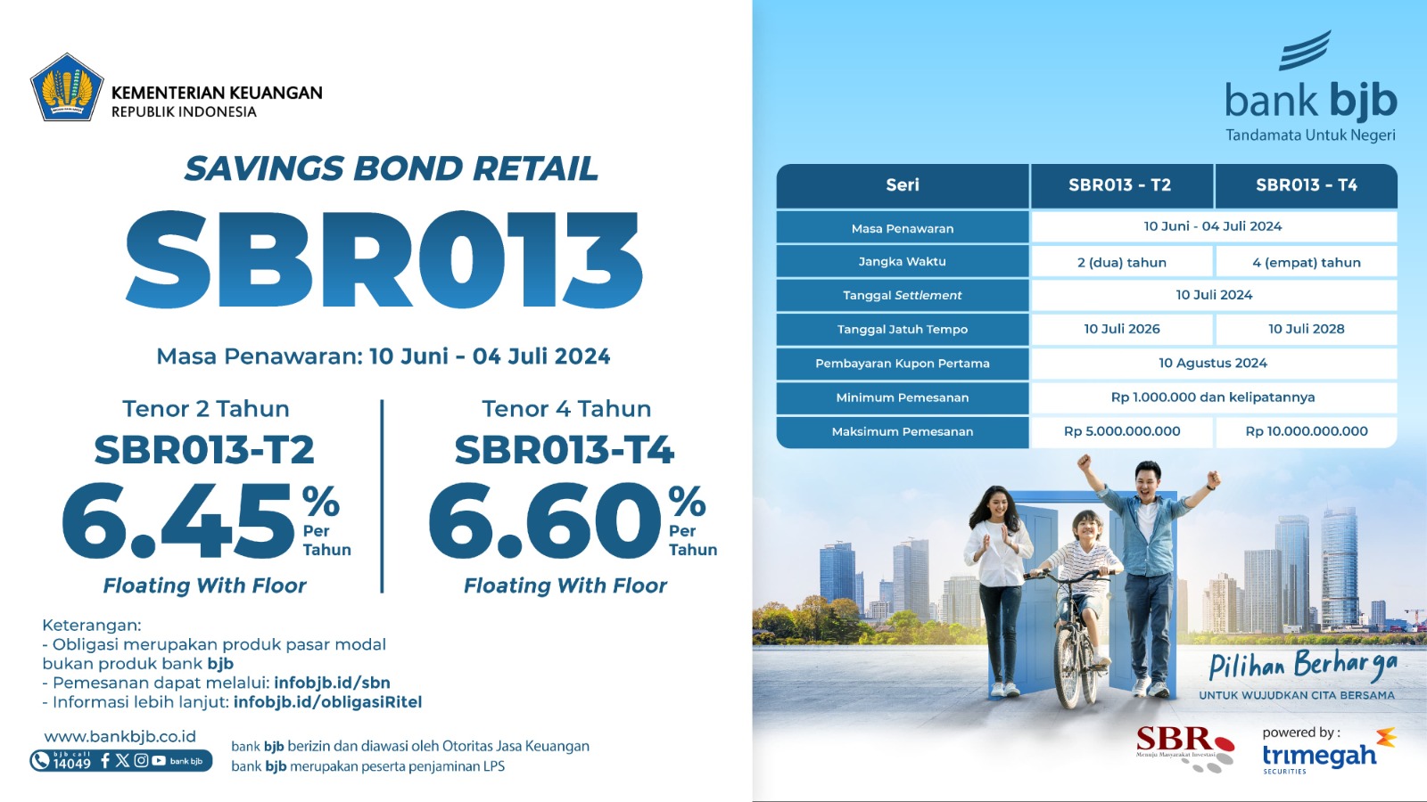 Penawaran SBR013 ini berlaku mulai tanggal 10 Juni hingga 4 Juli 2024. Para investor bisa melakukan pemesanan melalui bank bjb dengan proses yang mudah dan cepat.