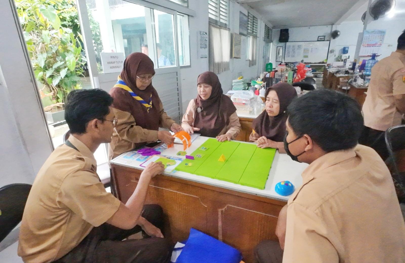 Guru SMPN 1 Baleendah berlatih menggunakan Card Mat Modular dalam sesi Computational Thinking. (Photo: Herdi)